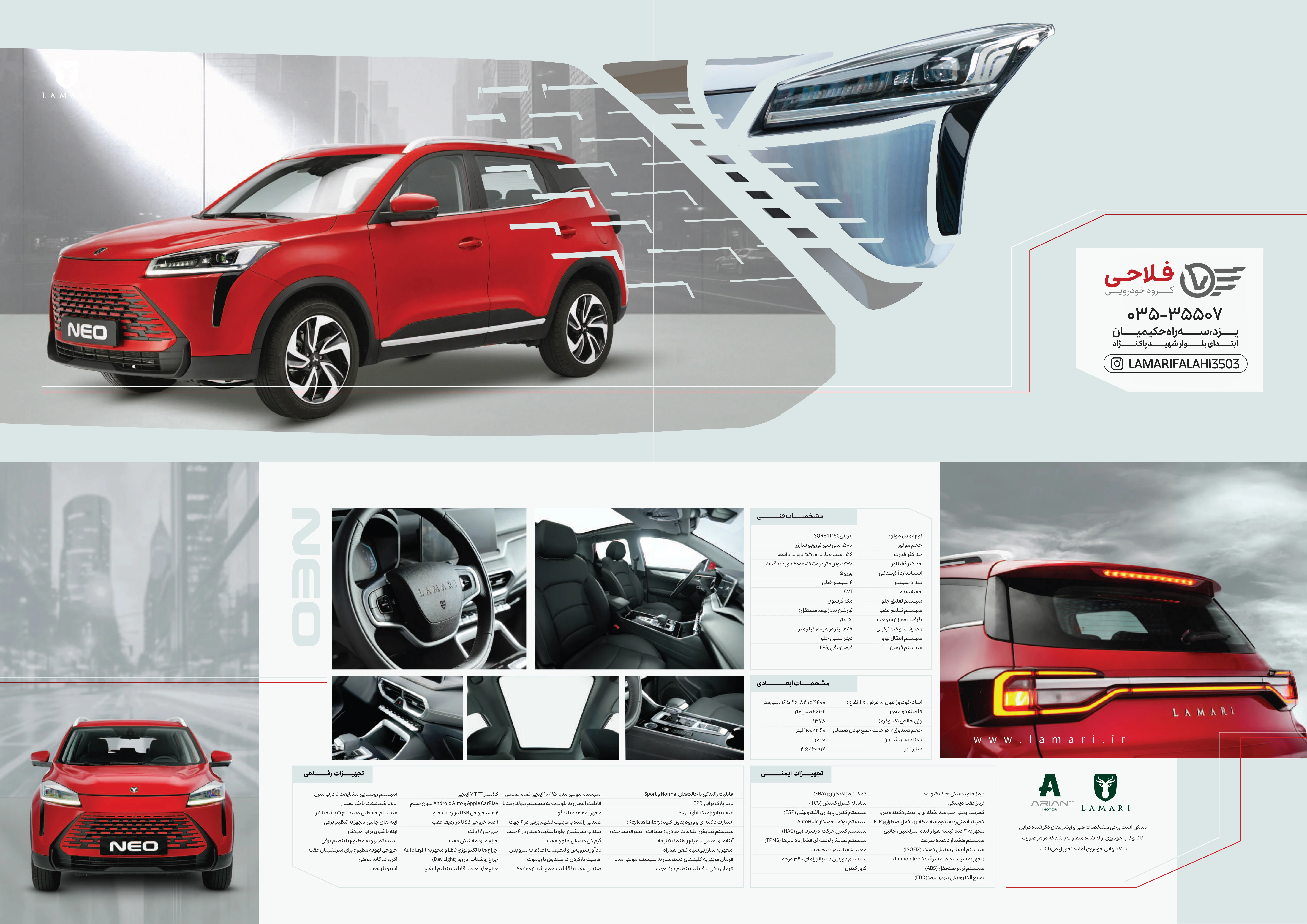 LAMARI NEO کراساوور جادار شهری با طراحی مدرن و پویا که ترکیبی هوشمند از زیبایی، فناوری و کیفیت را به نمایش میگذارد. نئو با ترکیب فناوریهای بروز و دقت در جزئیات ساخت، تجربهای ایمن و دلنشین از رانندگی در شهر را ارائه میدهد. با لاماری نئو، جادهها ممکن است تکراری باشند، اما تجربه رانندگی شما هرگز تکراری نمیشود.