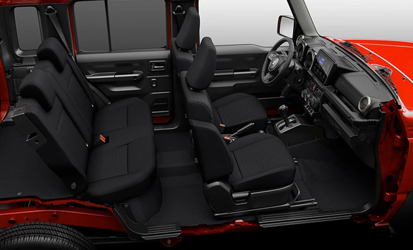 طراحی داخلی سوزوکی جیمنی 5 درب ساده، کاربردی و مینیمال است که به خوبی با ماهیت آفرود و ماجراجویانه این خودرو هماهنگی دارد. کابین جیمنی از مواد اولیه بادوام و مقاوم ساخته شده است که در برابر شرایط سخت رانندگی خارج از جاده مقاومت بالایی دارند.